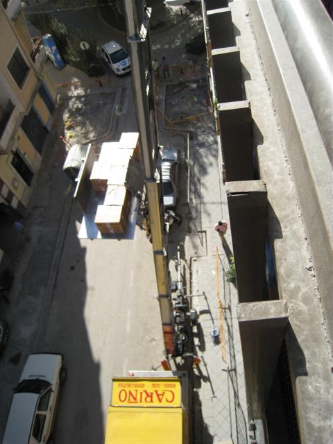 そうです。上の階の人が引越しをしていて、トラックの荷物をベランダから入れているところでした。写真は、少し見にくいかもしれませんが、荷物をクレーンで引き上げている所です。これがキティには相当怖かったらしく、モンスターに見えたのでしょうか、お尻も尻尾も下げて、見つからないように、と必死で物陰に隠れていました。