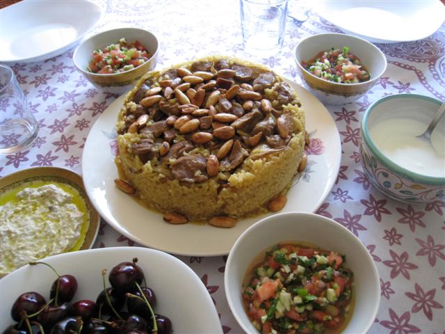 今日作ったのは、シリアやヨルダンで食べられている料理みたいですが、羊の肉を使った料理で、写真のように、出来上がりはケーキのようになります。羊の肉やナスが入った炊き込みご飯のようなものの上や周りに、イチゴの代わりにアーモンドをのせると、完成です☆お好みで、サラダをのせたり、ヨーグルトをのせたりして食べます。おいしかった♪