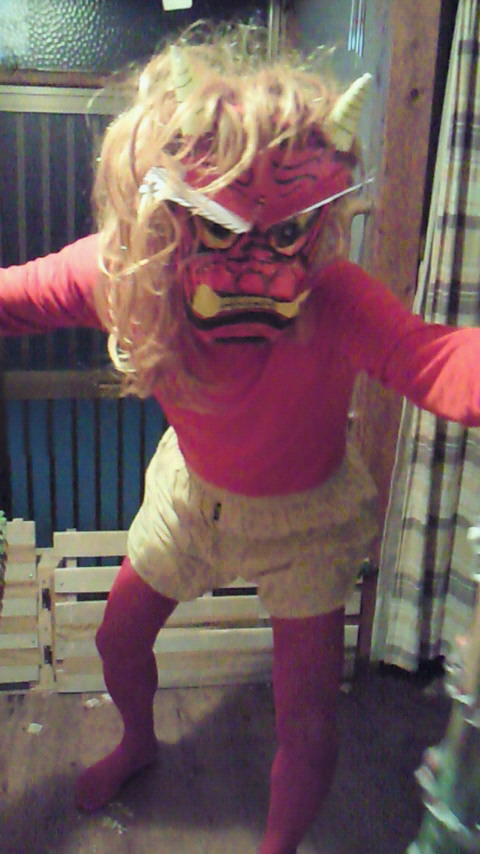 私たちが幼い時も鬼役をしてくれていましたが、その時に比べると更にバージョンアップで、お面も父親の手作りです^^こういうことには労を惜しまず、いつも楽しんでやってます。今年の髪の毛は少々ギャルが入っているので、鬼ギャルとでも名づけましょうか。鬼のギャルか。怖い;;