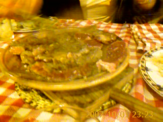 サラダ、パン、カマンベールチーズ焼きとか、焼きピーマン、とかいろいろ食べた後、メインディッシュとして、焼肉を食べました。焼肉と言っても、日本のようなタイプではなく、ステーキのような感じで、熱された皿の上に半分だけ焼けた肉が出てきて、テーブルに持って来られた後、ひっくり返して、好みの焼き加減で食べる、というものです。大粒の塩を使うので、とてもおいしく、バクバク食べてしまいました。こちらに来て初めての焼肉だったので、大興奮でした☆