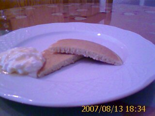 のはずですが…お気づきの通り、昨日のパンケーキとそれ程違いがありません。確かに、パンケーキよりは膨らみましたが、約1cm止まり…。それ以上は膨らみませんでした。な~ぜ~?焼き方が悪いのでしょうか?フライパンを温めた後、濡れ布巾の上でフライパンを少し冷まし、それから生地を流して焼く、という手順を踏んでいるのですが。