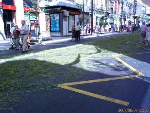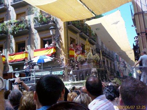 先週のお祭りのことになりますが、スペインでは、キリストの祭りの時には、写真のような、日本で言う『おみこし』を担いで行進をします。重い重いみこしを、下で何十人か人が支えて、同じ速度で、時には、上げたり下げたりしながら進んでいきます。そして上下する度に、大歓声が沸き起こります。