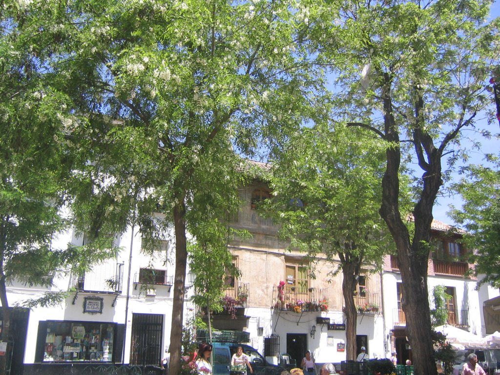 この辺りはアルバイシンの中心部分なので、周りには、カフェやアイスクリーム屋、魚屋、肉屋、八百屋や小さいスーパー、台所用品を扱っている店、アクセサリー屋、花屋、など、いろいろあります。だから、買い物には困らない場所です。と言っても、小さい店では、スペイン語ができなければ買えない所もあったりして(店が小さいので、客が歩き回ってほしい物を籠に入れる、というシステムではなく、ほしい物を言って、とってもらう、というシステムの所だったりするのです)身振り手振りでなんとかなる時もありますが、やはり、ほしい物の名前くらいはスペイン語で言えるようにしておかないとスムーズに買い物はできません;買い物に行く前には辞書でちゃんと単語を調べて行ってます。勉強、勉強。