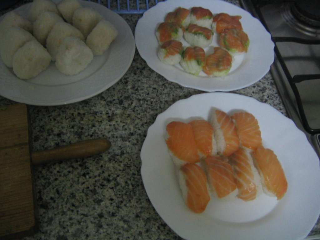 そして…やめとけばよかったのですが、何か日本的な物を、と思い、と言っても、日本食材は持ってなかったので、その時スーパーで買えた物(米とスモークサーモン、アボカド、玉ねぎ、ツナ、マヨネーズ、酢)で、思い切って左の写真のようなものを作ってみました。一応、寿司とおにぎりです;見た目はまずいけど;味はまぁまぁでした。でも、味よりも何よりも、喜んでくれたのが、作る姿。おにぎりを三角ににぎったり、寿司を握ったりする姿を見て、映画で見た映画で見た、と大騒ぎ。それで一気に距離が縮まりました。ま、それだけでも作ったかいがあったかな。みなさん!すみません。勝手にこんな不恰好なもので、日本代表づらをしてしまいました;今回は十分な材料もなかったし、いいものが作れなかったけど、次はもっとおいしいものを作るから、と言い訳をしましたが…次はないかも;