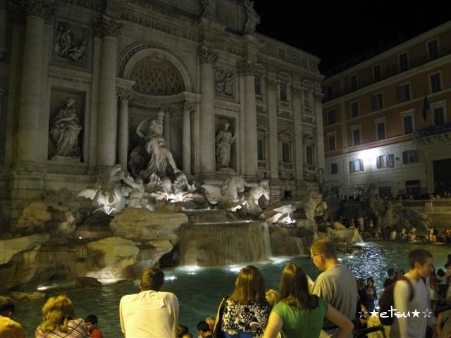 それから、ナヴォーナ広場で噴水の面白い像を見て、サンタンジェロ城が見える橋まで歩き、夜景に映えるきれいなお城を見ました。それから、バスに乗ってスペイン広場を目指した、つもりでしたが、教えてもらったバス番号はスペイン広場行きではなかったようで、橋を渡って、全く別の方向へと行ってしまいました。夜だったので、ひと気のない場所で降りた時は少し怖かったですが、親切な人に道を教えてもらい、無事スペイン広場までたどり着くことができました。そこで、スペイン階段を見て、トレビの泉へ歩いて行きました。