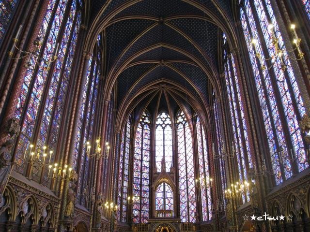 それから、ステンドグラスが素敵な教会、シャント・シャペルへ行きました。ここはセキュリティチェックで長い間待たないといけませんでしたが(たぶん中で裁判所とつながっているせいもあるんだと思いますが)、そこを抜けた所にあるチケット売り場では並ぶことなく、すぐ中に入ることができました。とてもきれいなステンドグラスに感動しました。