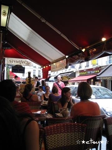 それから二人で、クレープを食べに行きました。若者が集まる、おいしい物がたくさんある通りへ行き、そこでラズベリー&ライムクレープを食べました☆おいしかったです。そしてこのクレープがその日の最初の食事。朝ローマを出てから、友達に会ってクレープを食べた午後5時半まで、無飲無食で走り回っていました。やっと一息。幸せな瞬間でした。その店を出た後、ふと気になる店を発見しました。女性のブラジャーがたくさんぶら下がっている店です。すると彼女は、ここの喫茶店(バー)は、ウェーターはみんな下着一枚の男性で、若い女の子がたくさん来る所なんだよ、と説明してくれました。かわいいクレープ屋さんやレストランの間に普通にあるので、びっくり^^;すごいなパリジェンヌ。