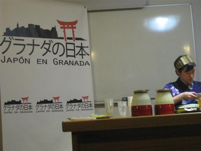 講習では、まず、講師であるグラナダ在住の女性の方が、お茶について分かりやすく上手に話をして下さり、次に、京都から来られたかわいい女子大生の方々が、浴衣姿で、お茶を点ててくれました。会場のみんなにお茶菓子が配られた後、抹茶を一口ずつ廻して飲んでいきました。最後に、質問タイムがあり、はっきりとは覚えていませんが、茶道は時間の無駄にはならないか、とか、さっき食べたお菓子は何でできているのか、とか、そういう感じの質問を投げかけられ、講師の女性の方は、上手に返していました。冗談も交えながら、笑いもとって、場を和やかにさせるその話術にとても感心してしまいました☆