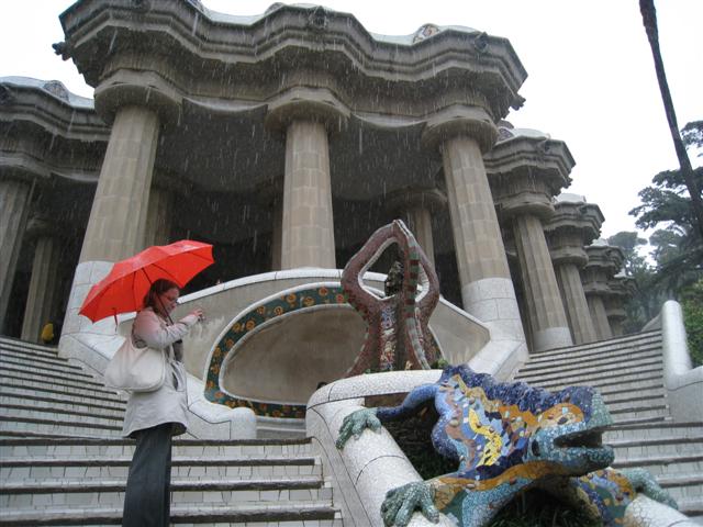 ということで、結局タクシーをつかまえ、グエル公園まで行きました。グエル公園は、最寄の地下鉄駅からけっこう歩く場所にあったので、地下鉄で行って、雨の中、うろうろと道を探しながらその区間を歩くより、タクシーに乗って公園まで行った方が賢い選択だったはず☆とポジティブに考えながら、タクシーを降りると、目の前にはグエル公園が。雨の中必死で、泥と雨でできた小さな川の上を歩き、トカゲの写真を撮り、柱で支えられた広場の下で雨宿りをし、ちょっと上がったところにある柱廊の素敵な曲線を堪能し、広場を少し見て、帰りました。