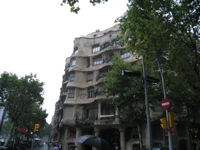 地下鉄の駅を出てから、カサ・ミラまで、天気のいい日だとすぐなんですが、この日はたどり着くまでにかなりの時間がかかりました。少し進んでは、店の軒先で雨宿り、を繰り返して、本当に少しずつ進んで行きました。途中、Dolce&Gabbanaでも雨宿りをさせてもらいました。なんて贅沢な雨宿り。そうしている内に、カサ・ミラが見えて来ました。降りしきる雨の中、身を投げ出し、必死に写真を撮りました。でも、雨との戦いの最中だったので、あまりいい写真は撮れませんでした^^;そしてすぐ、カサ・ミラの方へ進み、雨宿り。カサ・ミラで雨宿りをするという、またもや贅沢な雨宿りを体験してしまいました。