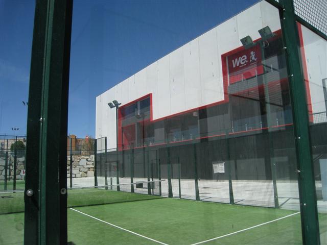 そのスポーツクラブは、前日のコメントでどきん☆chanが書いてくれた通り、Weという所です。とても大きく、Padelというスポーツのコートは、9面もあります。Padelは、テニスとスカッシュの間のスポーツという感じで、テニスのように対面で、ネットが間にあり、コの字型になった強化ガラスが背後にあります(写真は、その強化ガラス越しにスポーツクラブの建物の一部を写したものです)。そのガラスに当たって跳ね返ったボールを打つことができます。