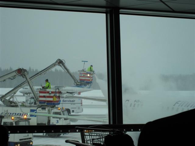 今回はフィンエアーで行きましたが、途中、フィンランドで経由する時、外が真っ白なのに驚きました。写真は飛行機について固まった雪を溶かしているところです。滑走路にも雪がありました。滑らないかとヒヤヒヤしました。やっぱり飛行機は怖い;;