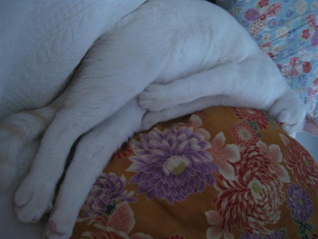 あ と、写真には撮れませんでしたが、以前、仰向けになって、私にお腹を見せた後、そのまま起き上がって、見事な『腹筋』をして見せてくれました。猫がふっき んしたー!と目の前の出来事に驚き、大興奮でした。腹筋するんだー。知らなかったからほんとびっくり。ってうちの猫だけ?;腹筋した後、しばらく、人間み たいに座ったままでいました。ちょうど、ストレッチでやるように、のばした足の先を手で触っているような状態。いとも簡単に苦もなく腹筋をやってみせるな んて、猫って身体能力やっぱ高いんだなぁ☆おもしろい体験でした。