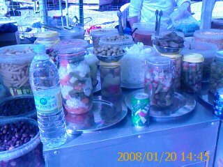この写真は、朝市に出ていたお店の様子ですが、このようにして、ニンニク味、ピリ辛味、など、それぞれの味つけで売られています。私はピリ辛が好みかな☆